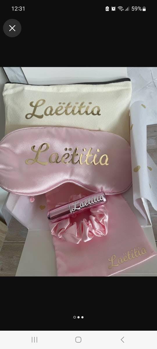 Box OR (pour les plus petits budgets) : Une trousse personnalisée + un masque de nuit + un chouchou + une pochette satiné